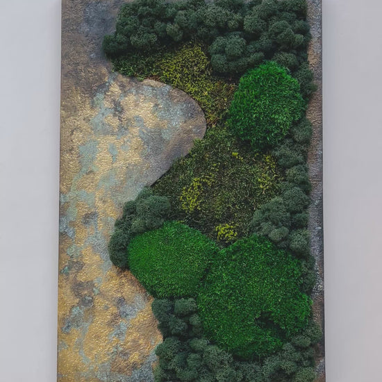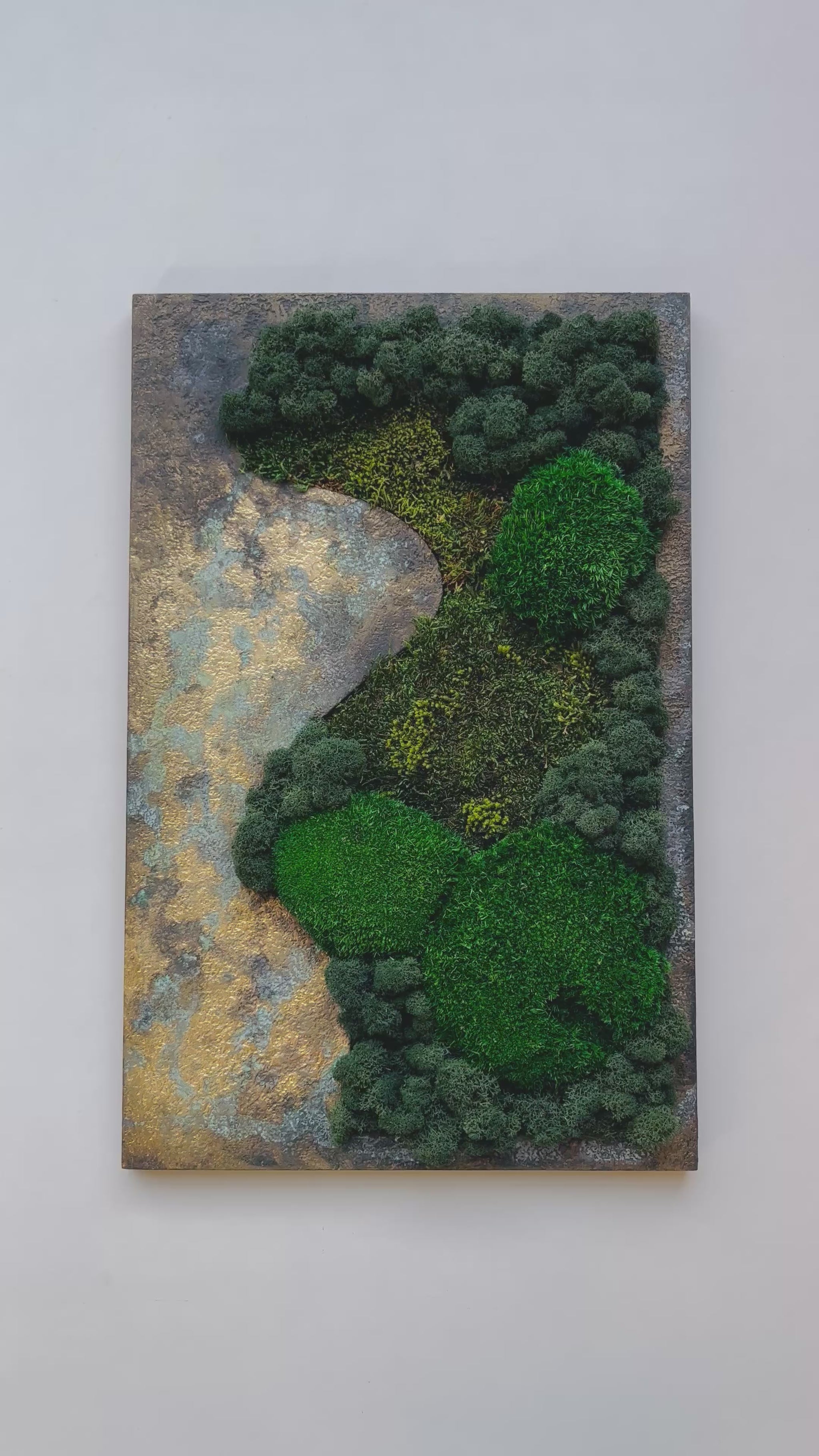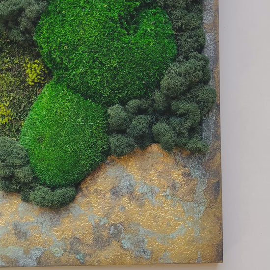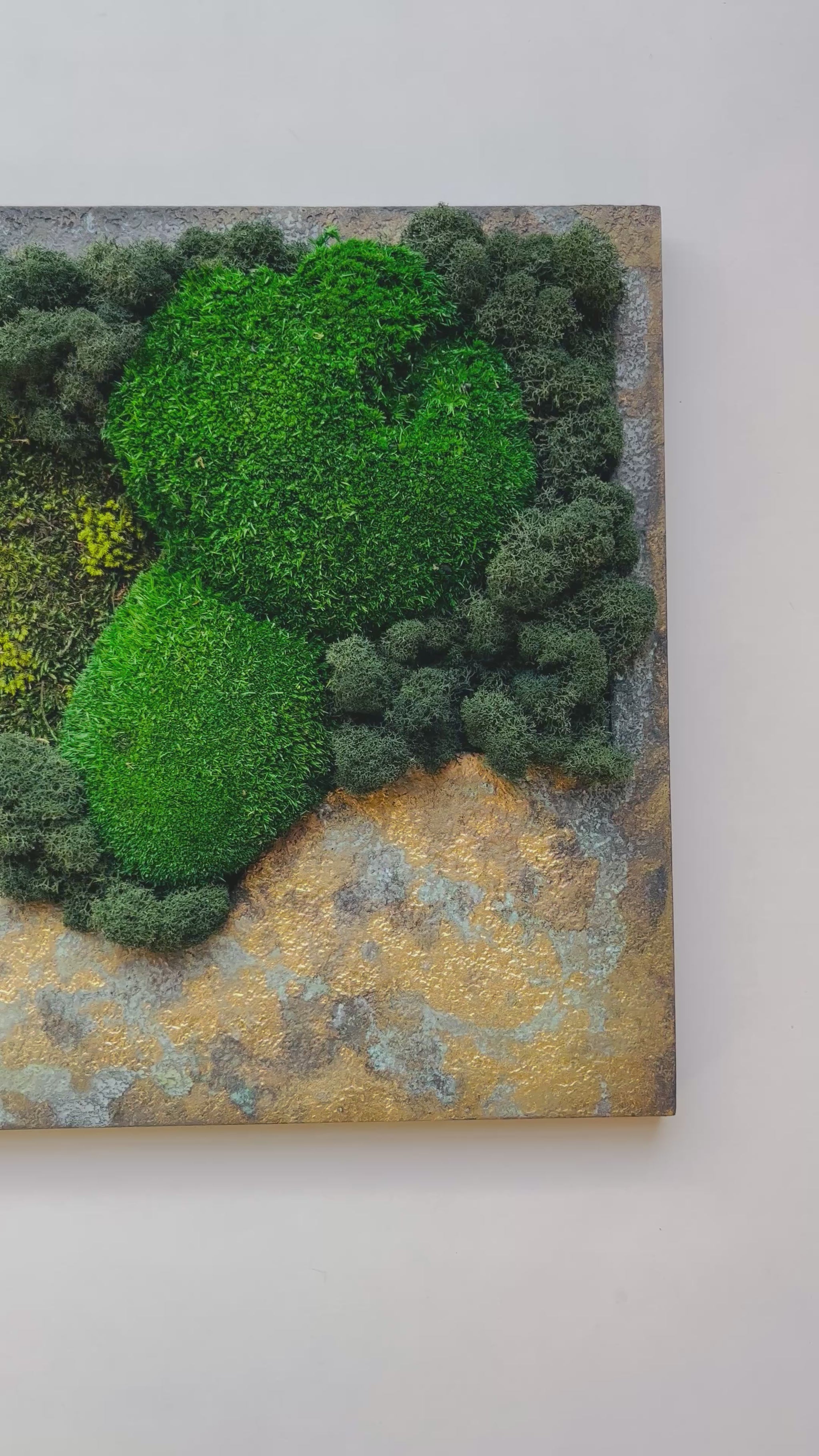 Šis kūrinys sujungia prabangų antikinio aukso spindesį su natūralia stabilizuotų samanų tekstūra, sukuriant harmoningą gamtos ir elegancijos derinį. Rankomis dažytas fonas išsiskiria sendinto aukso efektu, kuris suteikia paveikslui išskirtinį ir rafinuotą charakterį.