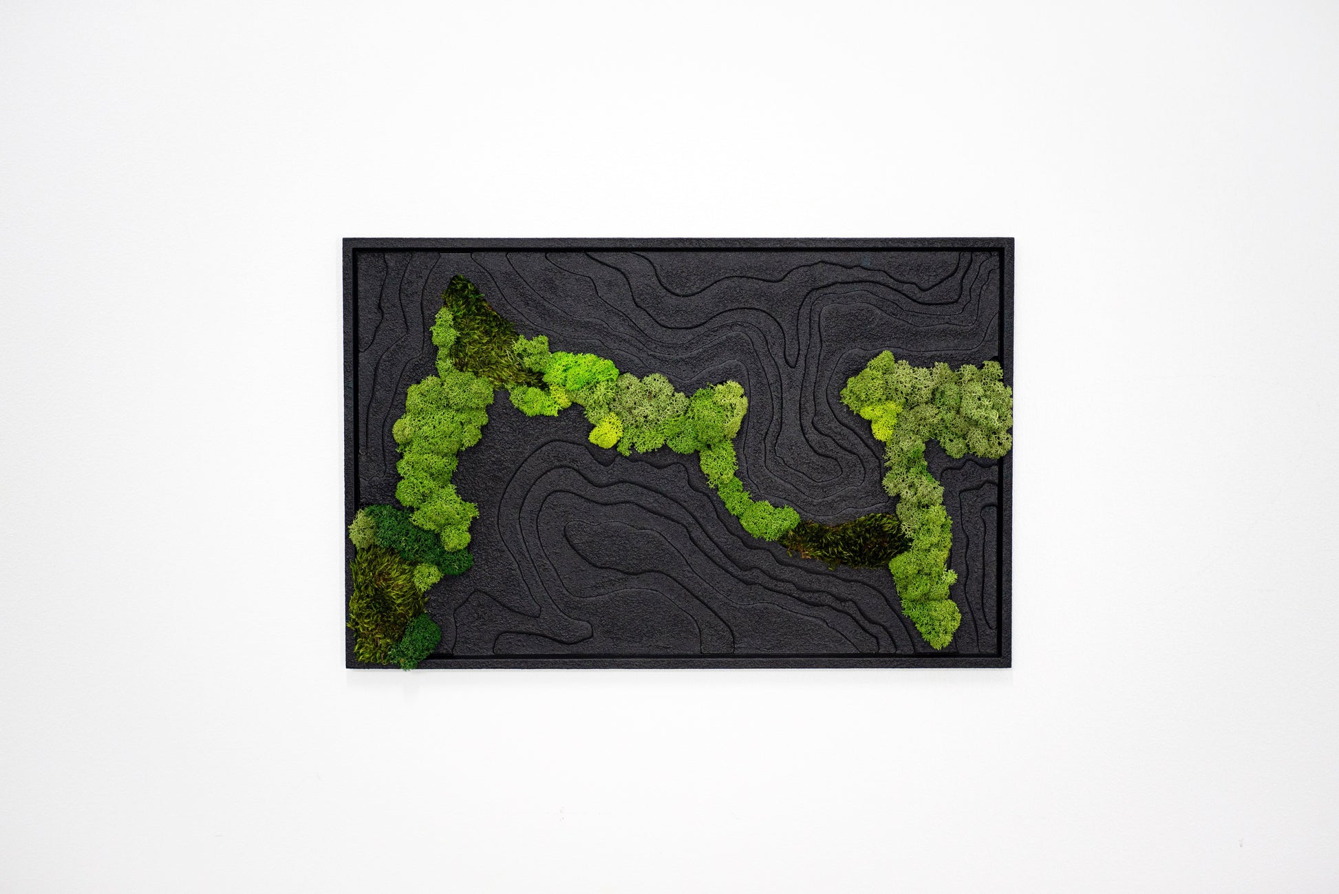 Reljefinis paveikslas su stabilizuotomis samanomis. Reljefas kontrastuoja su organiška, sodria samanų tekstūra, sukurdami daugialypį ir vizualiai įtraukiantį kūrinį. Tai harmoningas dirbtinių ir natūralių elementų mišinys. Dažytas rankomis, sukuriant švelnią tekstūrą.