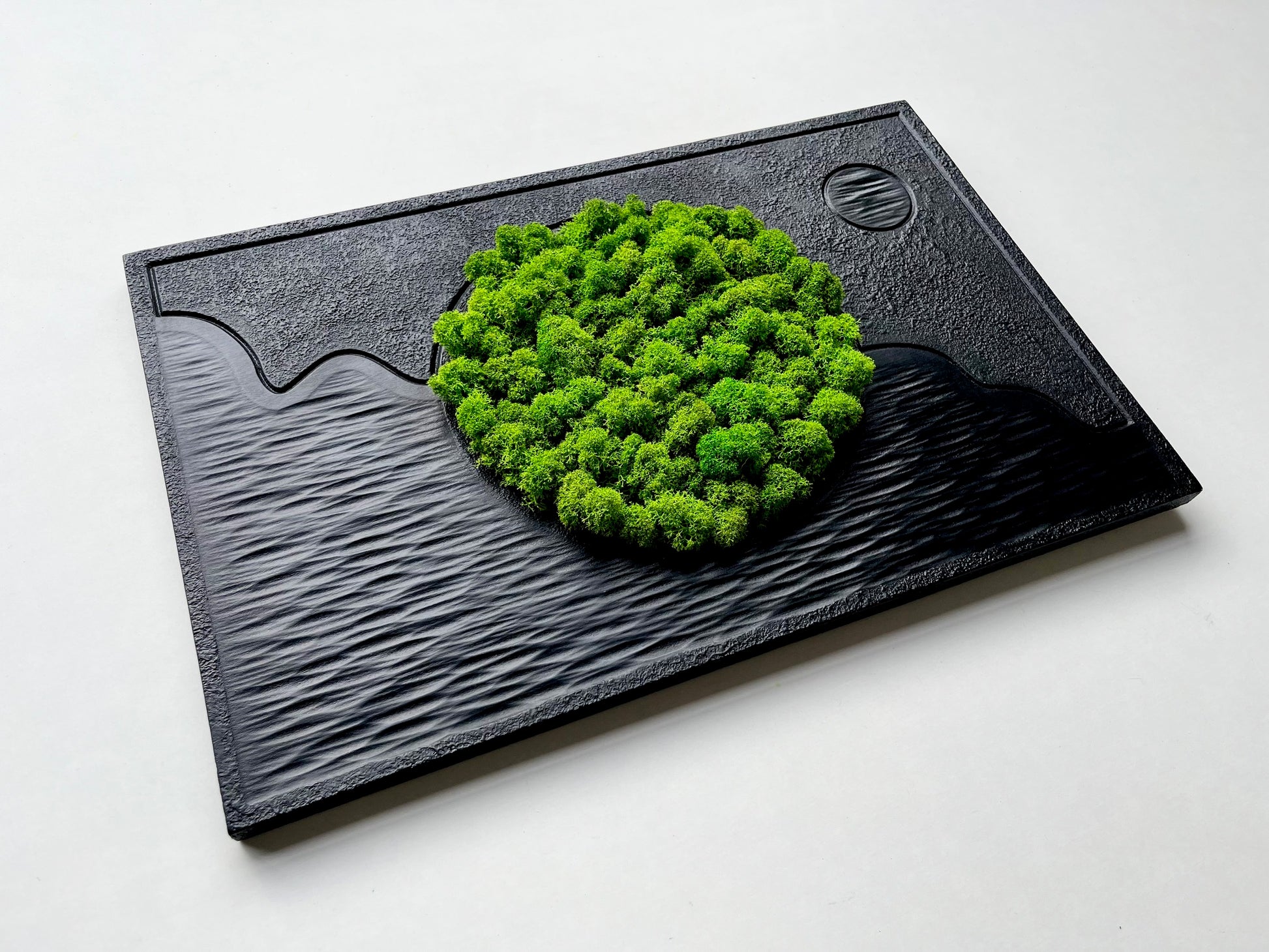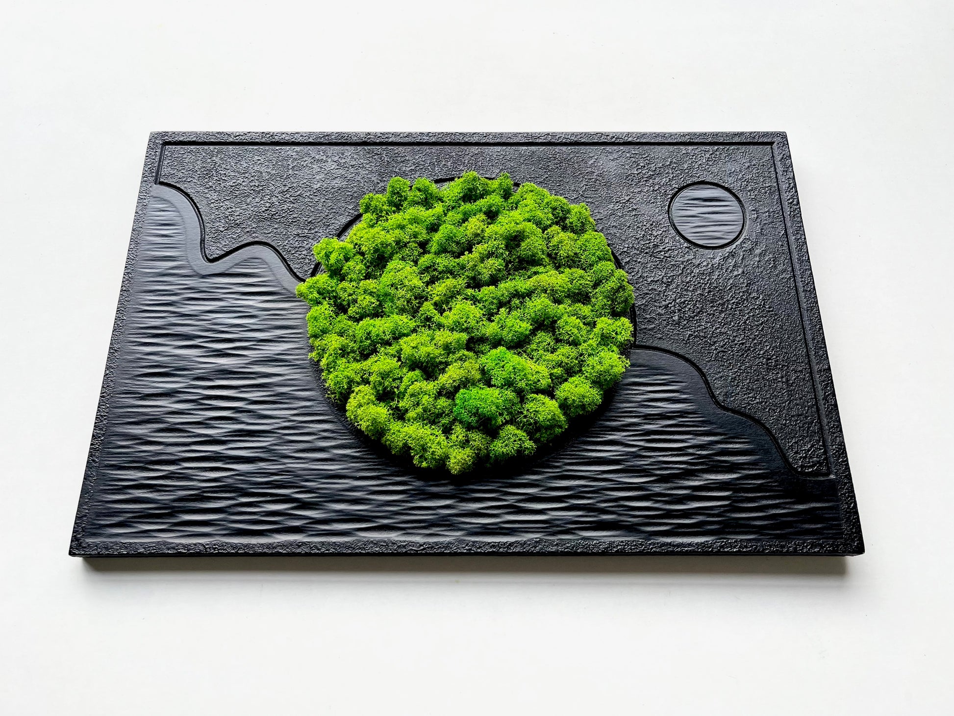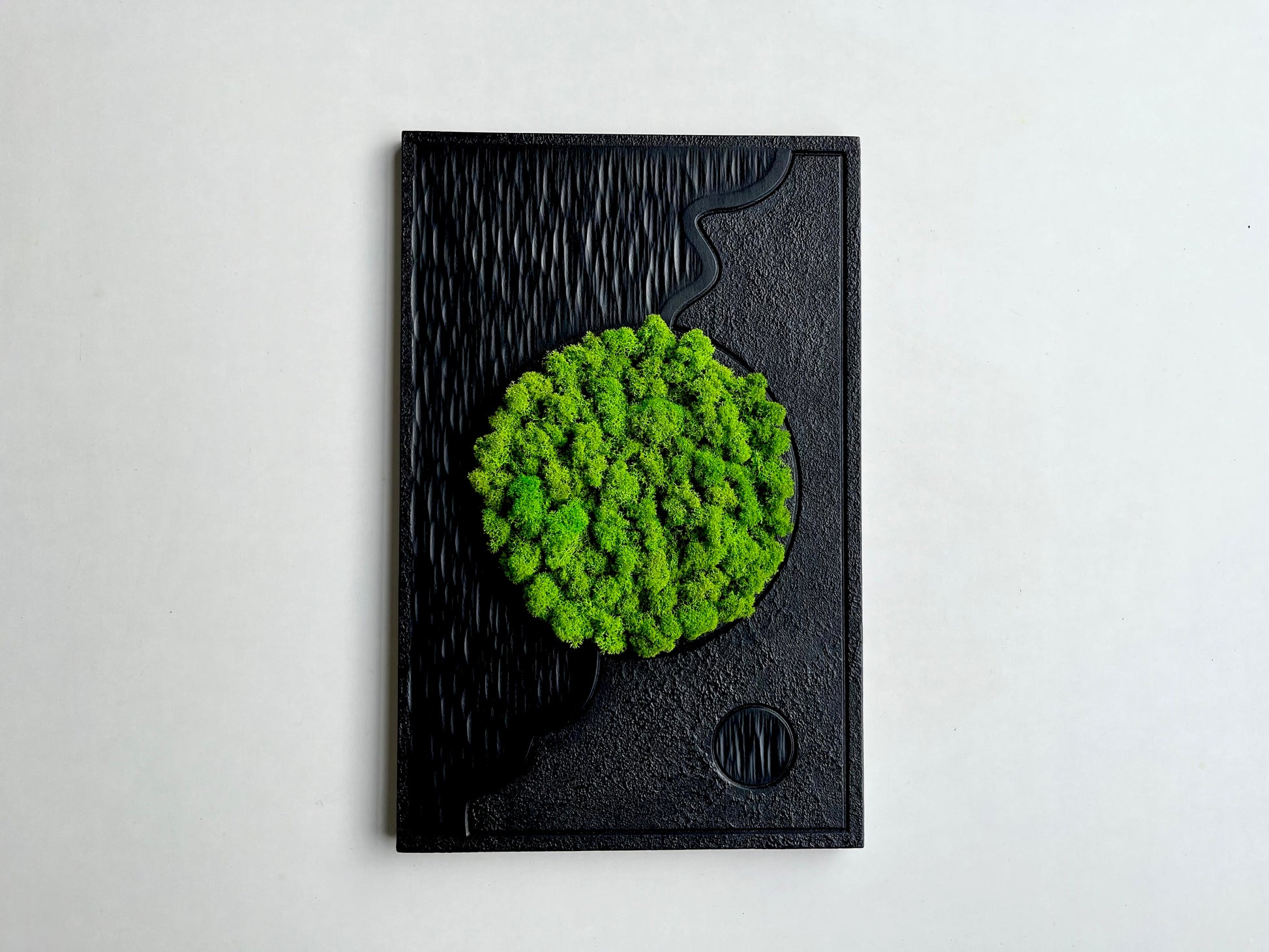 Šis paveikslas turi graviruotą tekstūrą, primenančią rankomis skaptuotą paviršių, dekoruotas stabilizuotomis smanomis. Kūrinyje susijungia natūralumas ir moderni estetika.